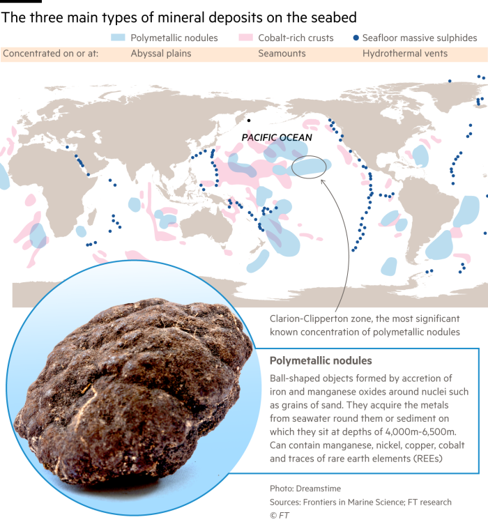 These valuable potato-sized nodules form on the ocean floor over millions of years under extreme pressure. They are rich in nickel, cobalt, copper, and manganese, all critical for making batteries and electrical wiring, plus some rare earth elements.